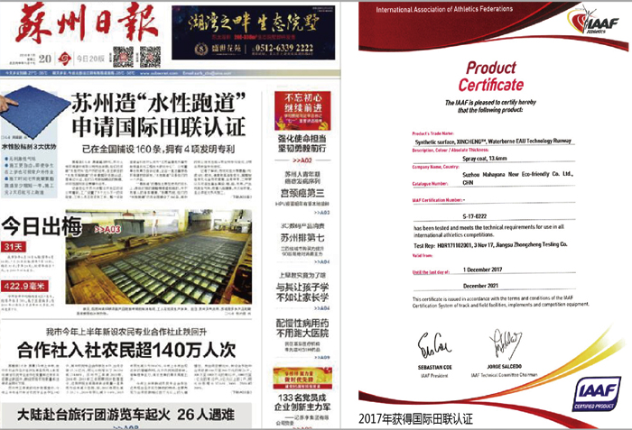 各項國際認證:國際田聯(IAAF)跑道認證,SGS國際認證,RoHS歐盟環境及健康認證,CE歐盟安全認證等